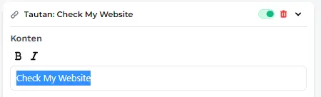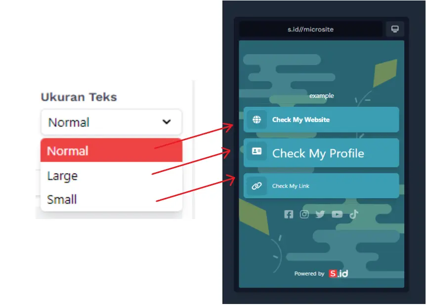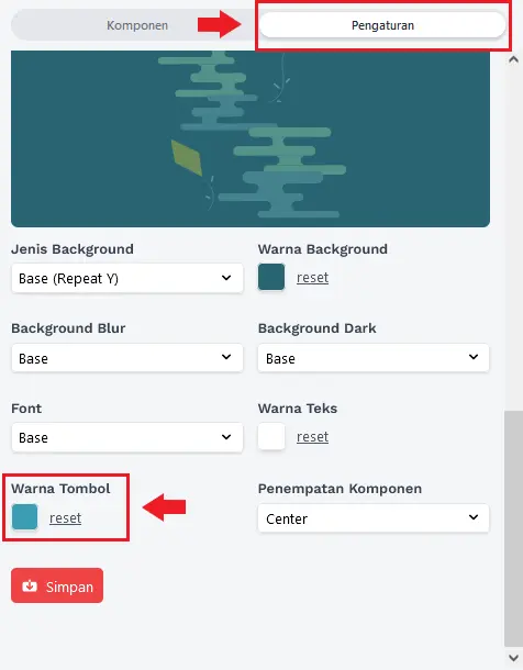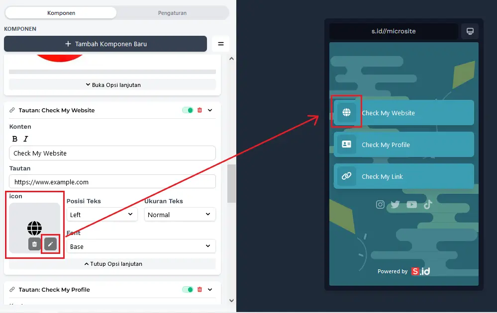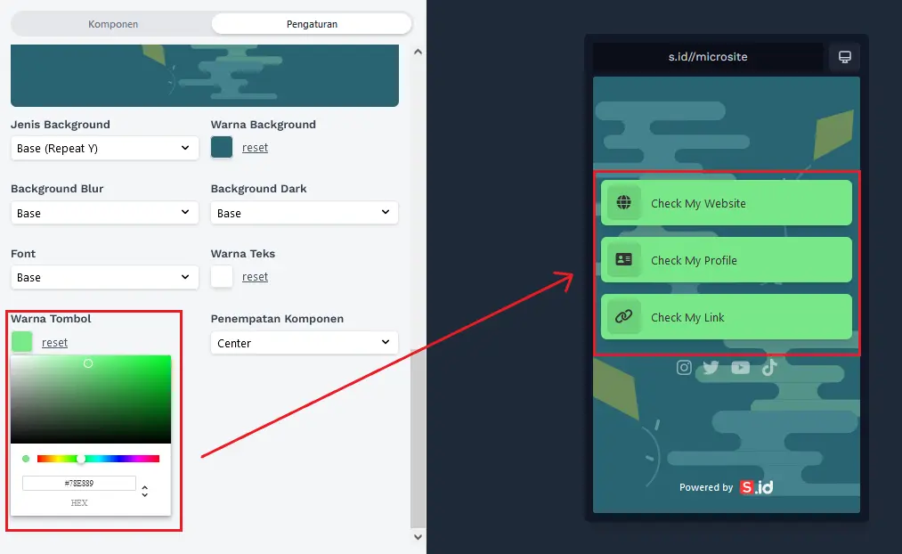Mengedit tombol microsite sangat mudah. Pertama, Anda dapat melakukannya di komponen Microsite. Kemudian, masukkan Nama Konten dan Tautan Anda. Selanjutnya, Anda dapat mengubah Teks, Font, atau Detail Ikon (atau memilih gambar dari komputer). Jika Anda ingin mengubah warna bilah tombol, Anda dapat pergi ke Pengaturan > gulir ke bawah dan klik Warna Tombol.