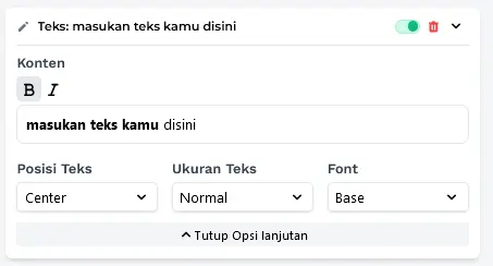 Jika Anda tidak menyukai desain teks saat ini, Anda dapat mengubahnya menggunakan Fitur Teks. Klik Buka Opsi Lanjutan untuk menampilkan semua fitur. Di bawah ini adalah deskripsi masing-masing fitur.