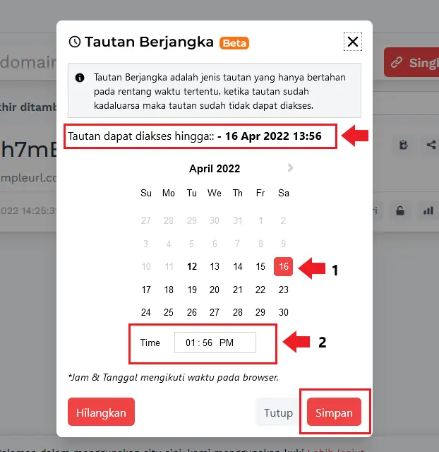 Atur kembali waktu akses tautan anda dan klik simpan.