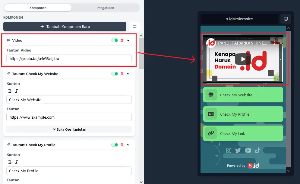 Tambahkan komponen video ke situs mikro Anda. Saat ini kami hanya mendukung video Youtube.