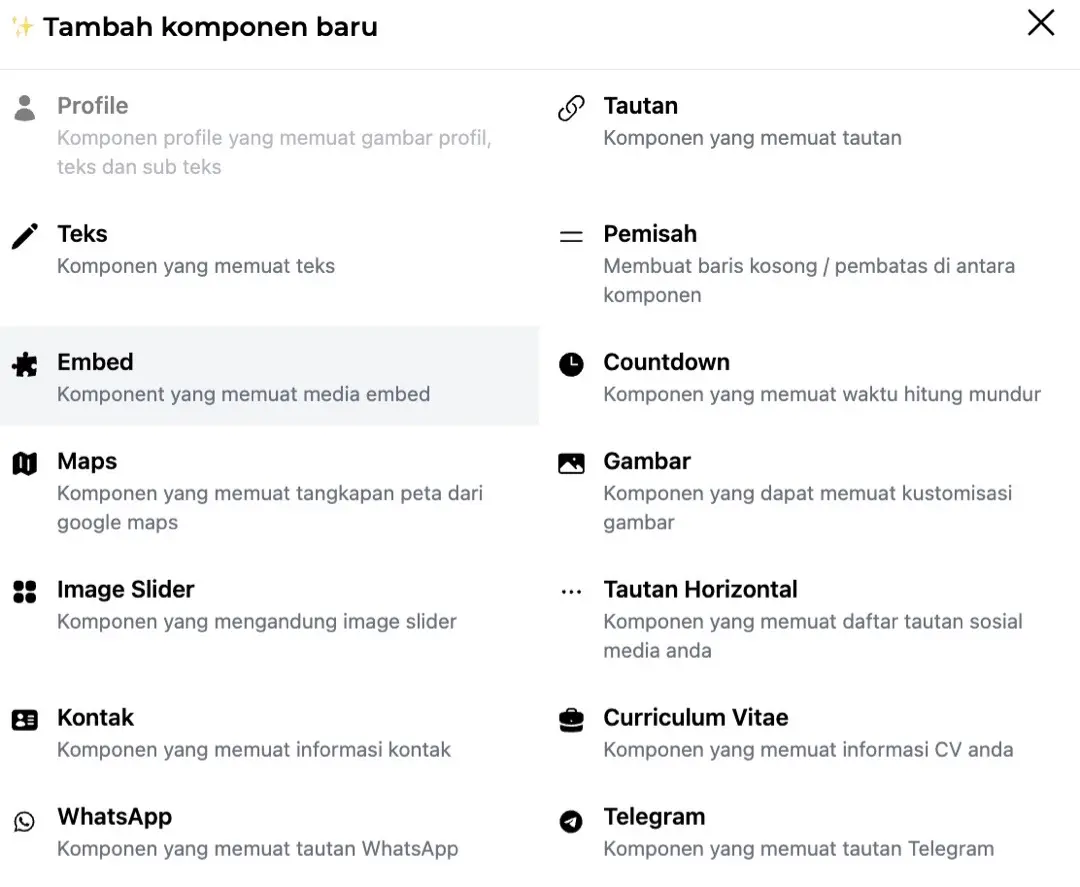 2. Klik Tambah Komponen Baru, lalu klik Embed.