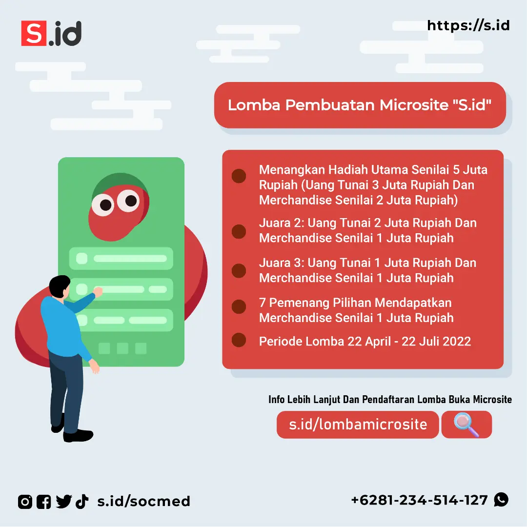 Untuk memperkenalkan microsite kepada masyarakat, maka pada ajang kali ini kami mengajak kalian untuk membuat suatu microsite yang menarik, dan unik dengan hadiah utama senilai 5 juta rupiah. Syarat lain yang perlu di lakukan yaitu peserta wajib menyebarkan link microsite ke media sosial peserta agar link microsite peserta banyak dikunjungi dan wajib mem-*follow *akun media sosial s.id.
