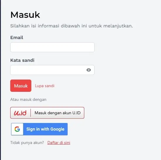 2. Silahkan Login dahulu dengan klik Masuk/Daftar sebelah kanan atas