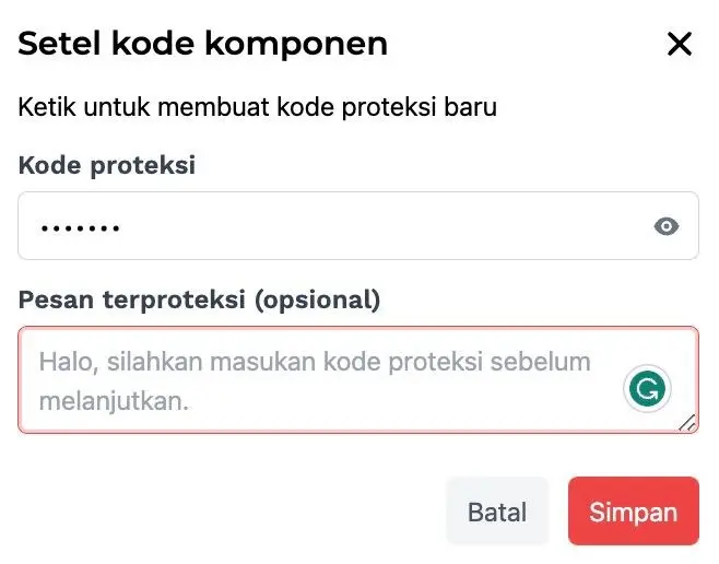 3. Isi password untuk memproteksi komponen anda dan juga pesan terproteksi (opsional) kemudian klik Save
